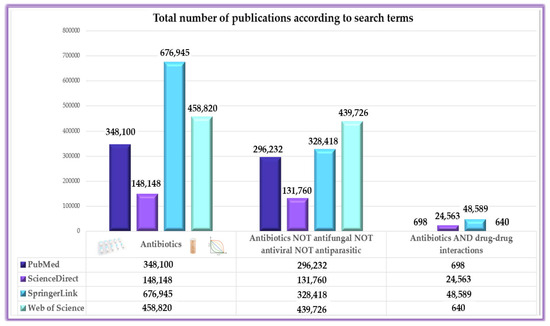 The working methodology included a predefined algorithm to generate results exclusively in the field under present evaluation (Figure 1). Furthermore, the methodological analysis also includes an evaluation based on Boolean operators (i.e., NOT, OR, AND) to emphasize that although studies with antibiotics in the foreground are numerous, being approached from many perspectives, publications evaluating their DDIs are significantly fewer (Figure 2), leading to an area of insufficient research that requires more extensive approaches. However, it can be seen from the results generated that the term ‘antibiotic’ in some cases includes in a broad sense also actions on fungi, viruses and parasites.