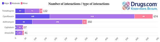 Therefore, based on statistical data provided by international organizations [132,136] and the scientific literature [131,133,140,141], the most commonly prescribed antibiotics worldwide (i.e., amoxicillin, cephalexin, azithromycin, ciprofloxacin, trimethoprim) were selected for screening potential drug interactions using various open access, English-based interaction checker databases (i.e., Drugs.com [142], Medscape [143], WebMD [144], DrugBank [145], and DDInter [146]).
