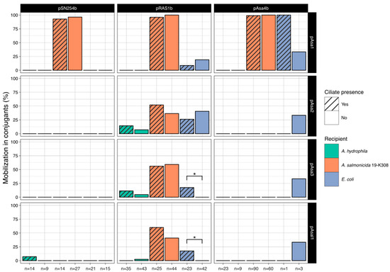 A two-tailed Fisher’s exact test was used to compare the proportion of plasmid mobilization in the presence and in the absence of ciliates for each combination of donor plasmid, recipient bacteria, and mobilizable plasmid, to assess whether ciliate presence could have an impact on plasmid mobilization, be it positive or negative. Only two conditions yielded a p-value lower than 0.05: with pAsa3 when transferred to E. coli through pRAS1b and with pAsal1, also when transferred to E. coli through pRAS1b (p = 0.013079 for both). In both cases, the presence of ciliates is associated with a greater mobilization of these small plasmids.