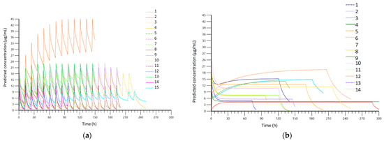 Figure 2a,b) is difficult to interpret; therefore, it is necessary to perform pharmacokinetic modeling. A comparison of the PK modeling profiles of all patients in the II group (