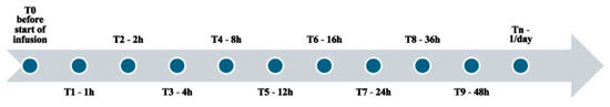 Nurses not involved in the study were appointed to administer the antibiotic and to obtain blood samples for each patient. The blood samples were obtained at regular intervals from each volunteer. These commenced immediately prior to the initiation of infusion (T0) and then again at 1, 2, 4, 8, 12, 16, 24, 36, and 48 h from the start of the drug infusion. Subsequently, a single daily sample was taken until the completion of the treatment (