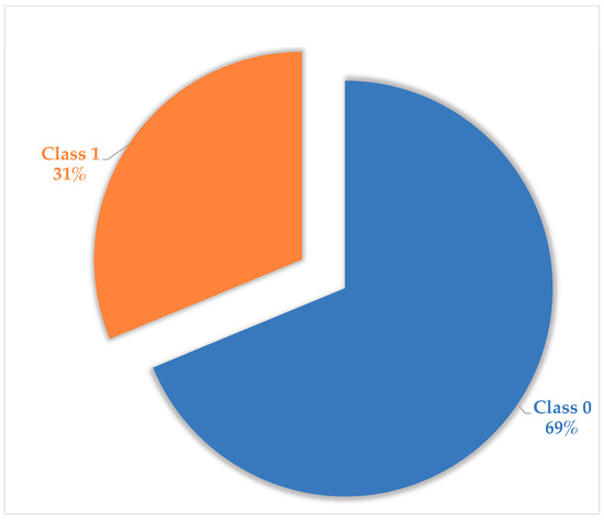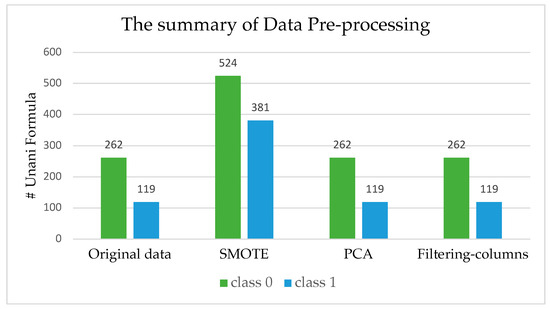 The next step in the process is to assign the formulas into two categories: antibiotics and non-antibiotics. The (class 1) “antibiotics” indicate that the corresponding Unani formula can cure diseases caused by bacteria. In contrast, the (class 0) “non-antibiotics” signifies that the corresponding Unani formula can cure diseases except those caused by bacteria 2. Our colleague, who has a medical background, assisted in this process. For example, the formula called “ArqSoya” that can cure Acidity of stomach and dysentery was assigned to antibiotic class. Contrary to that one, the formula called “Dawaul Misk Mutadlil” that can cure Weakness of brain, Heart and liver, Melancholia, and Insanity was assigned to non-antibiotics class. As a result, the final dataset is a tabular dataset consisting of Unani formulas as objects, metabolites as feature data, class labels, and the shape of our dataset is [381 × 4689]. The ratio of two classes in our data can be seen in Figure 5. A dataset in which the blue class (class 0) accounts for 68.8% of the samples and the orange class (class 1) represents 31.2% of the samples is considered imbalanced. This dataset’s class imbalance ratio (CIR) is 2.21, greater than 1. This ratio indicates more than twice as many samples in the pink class as in the blue class. Generally, a dataset is considered imbalanced when the CIR is greater than 10. However, even a CIR of 2.21 can pose problems for machine learning algorithms not explicitly designed to handle imbalanced datasets. It is essential to address the imbalance status of a dataset before training a machine learning model. This action can be achieved by oversampling the minority class, under-sampling the majority class, or using a machine learning algorithm that is designed to handle imbalanced datasets.