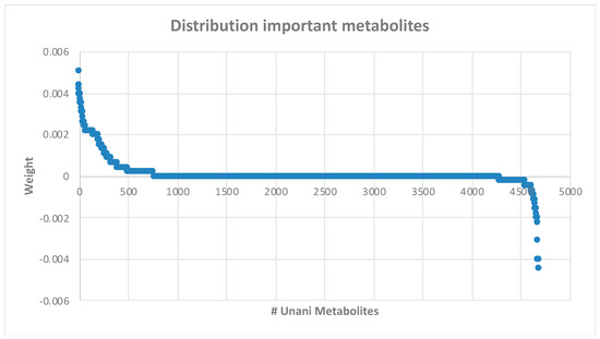 After finding the optimal pair of a machine learning model and pre-processing method for Unani-metabolite data, we utilized the variable importance attribute of the best model, which was implemented using the KerasRegressor and PermutationImportance package. We then attempted to rank the list of metabolites based on their weight (distribution of weight values can be seen in Figure 2), representing each feature’s importance for the network’s computations. These weights are adjusted during training to minimize the error between the network’s predictions and the target weight, meaning that the corresponding feature substantially impacts the network’s output.