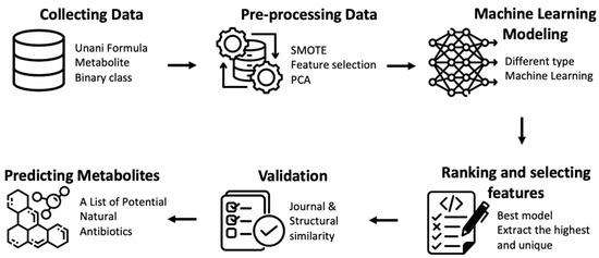 The methods used in the current study are depicted in Figure 4. The primary steps involve (1) collecting data, (2) pre-processing the data, (3) creating a machine learning model, (4) ranking and selecting features, (5) validating the model, and (6) predicting metabolites.