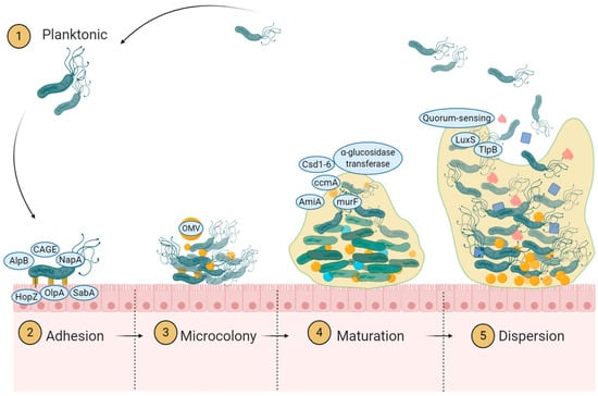H. pylori mutants with impaired motility (∆motB) or flagella production (∆fliM, ∆fliA) exhibit reduced ability to form mature biofilms, partly because of the presence of flagellar filaments in the biofilm structure [46]. Adjusting H. pylori’s phenotype during biofilm growth involves metabolic changes and the transformation of flagella into adhesive structures, further emphasizing the role of motility in biofilm development [48]. Biofilm formation in H. pylori has been associated with increased antibiotic resistance, with mature biofilms showing significantly higher resistance levels compared to planktonic cells [7]. This ability possessed by mature biofilm is contributed by the structure that consists of: