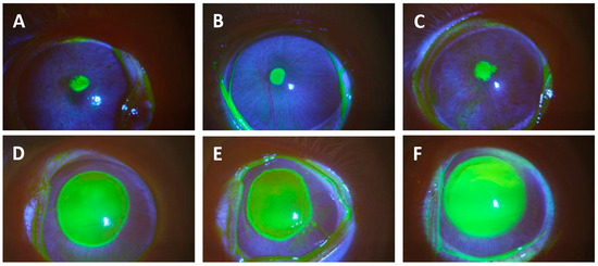 This figure presents photographs of corneas stained with 1% sodium fluorescein from eyes infected with XDRPA CDC1270 after 16 h of infection. Yellow staining shows epithelial defects. Photographs (A–C) are small defects from eyes that initially had intact epithelium, but ulcers had formed during the infection period. These were representative of the small ulcers described in this study. Photographs (D–F) show large defects from eyes that had their epithelium abraded with an Amoils Epithelial Scrubber prior to inoculation. These images were from animals used in a prior study [19] but have not been presented in a publication.