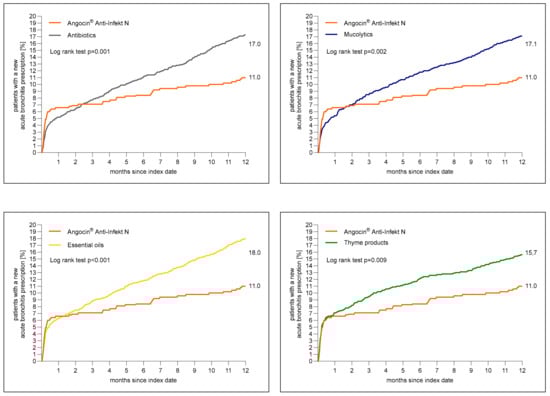 Patient data were collected for data analysis from the time of the first occurrence of acute bronchitis. This point in time was defined as the index date. The differences in proportions of patients with a renewed confirmed acute bronchitis diagnosis as well as antibiotic prescriptions within 1 to 365 days after diagnosis between the Angocin® and any comparison cohort were evaluated using Kaplan–Meier curves. Univariable conditional Cox regression models were used to investigate the association between Angocin® prescription and the probability of acute bronchitis recurrence or antibiotic prescription. Additionally, logistic regression models were calculated as proportional hazard assumptions were not met in some cases.