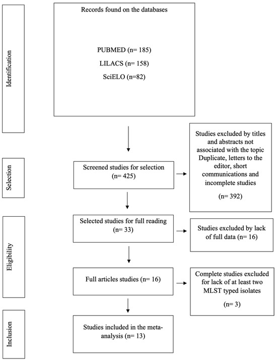 Data collection, extraction, and analysis were performed independently by two researchers (HSR and PASS), which organized the data in tabular form with the aid of Microsoft Office Excel 365. In case of disagreement, discussions were resolved by two other researchers (YCR and MJAS). All data were collected and reviewed in June and July 2024 and included the following: (1) title; (2) year; (3) database; (4) type of study; (5) sample/isolates period; (6) region; (7) setting; (8) number of samples/isolates; (9) number of MLST-genotyped samples/isolates; (10) MLST genotypes; (11) resistance phenotype; (12) results of resistance markers; and (13) results of virulence markers.