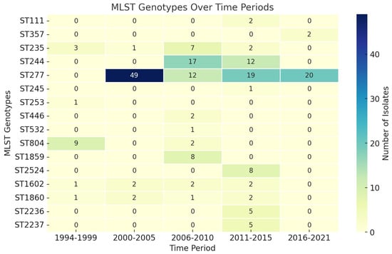 Distribution of the main P. aeruginosa MLST genotypes identified within studies across different time periods among isolates from 1994 to 2021.