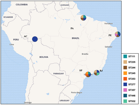 Distribution and regional spread of HRCs and emerging HRCs among P. aeruginosa isolates in Brazil. Legend: ST (sequence type), PA (Pará state), AC (Acre state), PE (Pernambuco state), SP (São Paulo state), RJ (Rio de Janeiro state).