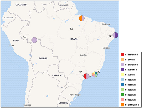 Distribution and regional spread of HRCs and non-HRCs of P. aeruginosa harboring MβL genes in Brazil. Legend: ST (sequence type), PA (Pará state), AC (Acre state), PE (Pernambuco state), SP (São Paulo state), RJ (Rio de Janeiro state).