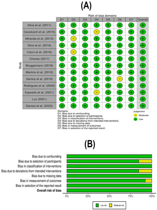 ROBINS-I Risk of Bias Assessment. Risk of bias assessment using the ROBINS-I tool for the observational studies included in the meta-analysis. (A) Evaluation of individual study parameters, and (B) combined data evaluation for each methodological parameter assessed [40,41,42,43,44,45,46,47,48,49,50,51,52].
