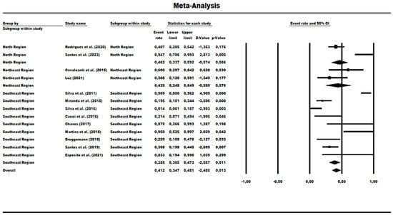 A total of 13 studies were evaluated to determine the prevalence rate for HRCs and non-HRCs among the MLST-genotyped isolates, revealing the combined prevalence rate of 41.20% (0.412) (95% CI = 0.347–0.481) (Figure 7). The statistical analysis showed significant differences among the studies (χ2 = 74.41; df = 12; p < 0.001; I2 = 83.87%), indicating high heterogeneity. A subgroup group analysis was performed based on Brazilian geographic regions: In the North region, the prevalence rate of MLST-genotyped samples was 46.20% (0.462) (95% CI = 0.337–0.592), but analysis also showed significant variability among the studies within this region (χ2 = 9.41; df = 1; p-value = 0.002; I2 = 89.37%). The Northeast region had a prevalence rate of 43.90% (95% CI = 0.248–0.649), and it was observed as a low level of heterogeneity with no statistical significance (χ2 = 1.90; df = 1; p-value = 0.168; I2 = 47.43%). In the Southeast region, the prevalence rate was much lower at 38.50% (95% CI = 0.305 to 0.473), and with a mean difference in heterogeneity among the studies within this region (χ2 = 62.09; df = 8; p-value < 0.001; I2 = 87.11%) (Figure 7).