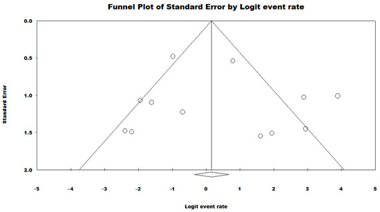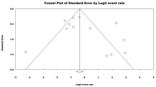Funnel plot assessing potential publication bias in the meta-analysis of the prevalence of the ST277 genotype among HRCs of P. aeruginosa in Brazil [40,41,42,44,45,46,47,48,49,50,51,52]. Each circle typically represents an individual study included in the meta-analysis. The position of the circle on the plot indicates the estimated effect size of that study (on the x-axis) and its precision (on the y-axis), often measured by standard error or sample size. Rhombuses may be used to highlight certain studies within the funnel plot. For instance, they can represent studies that are considered outliers or those that have been flagged for having methodological issues or other biases.