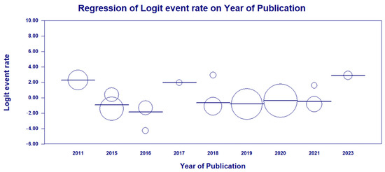 As high heterogeneity was found among the studies investigated in this first analysis, a meta-regression was conducted in terms of the year of publication of each study in fixed model effects, indicating a statistical significance and suggesting the potential bias source (χ2 = 56.01; df = 8; p-value < 0.001) (Figure 9).