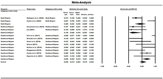 A proportion analysis was also performed from the perspective of the MLST-genotyped data from the samples from these studies. In this sense, the prevalence of ST277 in relation to other HRC STs found in these studies was determined. Only one study of the 13 evaluated in the previous analysis was now ineligible as no HRCs were detected (Silva et al. [43]). The analysis revealed a prevalence rate of 54% (95% CI = 0.412–0.663). In relation to geographic subgroups, the North region presented a prevalence of 42.8% (95% CI = 0.242–0.636). The Northeast had a low frequency rate of 14% (95% CI = 0.02–0.47). Regarding the Southeast region, it presented the highest rate of 69% or 0.690 (95% CI = 0.523–0.818) (Figure 10). Regarding the heterogeneity between studies, the Northeast region was the only one that did not present a significant difference (χ2 = 0.101; df = 1; p-value = 0.75; I2 = 0%), while the other analyses for both subgroups and overall revealed high heterogeneity in the data (overall [χ2 = 46.175; df = 11; p-value < 0.001; I2 = 0%]; North [χ2 = 11.665; df = 1; p-value < 0.001; I2 = 91.42%]; Southeast [χ2 = 25.171; df = 7; p-value < 0.001; I2 = 72.19%]) (Figure 10).