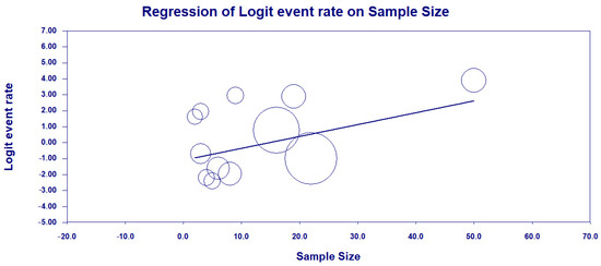 As high heterogeneity was found among the studies investigated, a meta-regression was performed in terms of the sample size of each study in fixed model effects, indicating a statistical significance (a positive association between sample size and HRC classification) and suggesting the potential bias source (coefficients = −1.0983; 95% CI = −2.02–−0.16; p-value = 0.0014) (Figure 12).