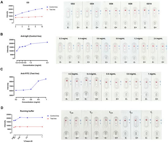 In-house LFA optimization (A) anti−biotin conjugated AuNPs concentrations, (B) anti−IgG antibody concentrations, (C) anti−FITC concentrations, and (D) % tween−20 in running buffer.