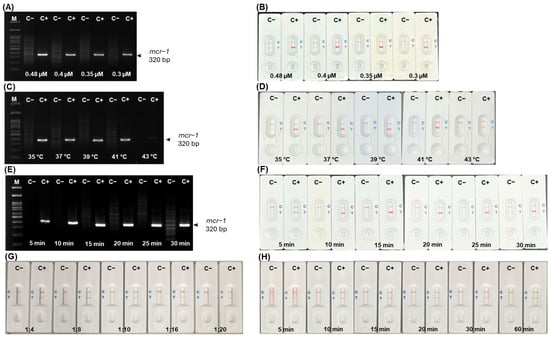 Optimization of RPA and LFA for mcr-1 detection on AGE and LFA, respectively. Primer concentrations (A,B); temperature (C,D); and incubation time (E,F); RPA product: buffer ratio at 1:4–1:20 (G) and detection time on LFA (H). [M, 100 bp Marker; C−, no template control; C+, positive DNA control].