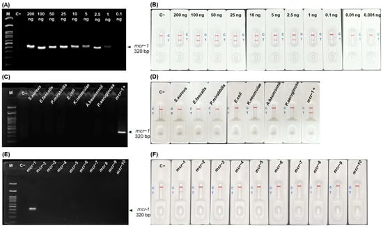 LOD and cross-reactivity for mcr-1 detection by RPA-LFA. AGE results at different DNA template concentrations (0.1–200 ng) (A) and corresponding LFA (B). AGE results with 7 bacterial strains (C), mcr-1 to mcr-10 (E) and corresponded with LFA (D,F) detection. [M, 100 bp Marker; C−, no template control; C+, positive].