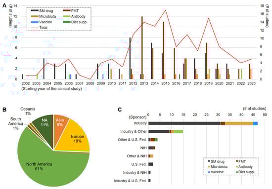 Schematic presentation of the 146 clinical trials to develop therapeutic options for CDI. Analyzed the data from http://www.ClinicalTrials.gov, accessed on 4 September 2023. (A) The year of starting the clinical study by category of the therapeutic interventions, (B) continent-based locations running the clinical study (multiple choice was made if the study was conducted in multiple continents), (C) sponsor types of the clinical trials by category of the therapeutic interventions. A total of 146 clinical trials targeting CDI started before 4 September 2023, extracted from ClinicalTrials.gov, were analyzed. SM drug, small molecule drug; FMT, fecal microbial transplantation; diet supp., diet supplement; U. S. Fed., The United States Federal; NIH, National Institute of Health; NA, not available to accept the data.