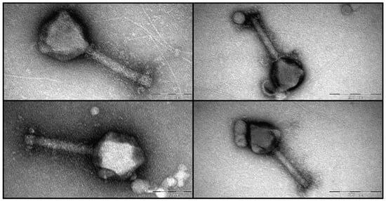 A 1:10 dilution of isolated phage was made, according to the method [], and phage was purified by adding 100 µL of overnight host bacteria culture at OD600 to tubes containing 10 µL of phage lysate dilution (10-5, 10-6, 10-7, 10-8 and 10-9) and incubated at 37 °C for 10 min. 3 mL of molten top agar was added, mixed, and poured on an agar plate. It was allowed to cool until the top agar solidified and then incubated overnight at 37 °C. Visible plaques were counted, and PFU/mL was determined []. Plaques were picked from the overlays and transferred into 300 µL SM buffer (buffer: 5.8 g/L, MgSO4. 7H2O, NaCl 2 g/L, 10 mL/L 1M Tris-HCl (pH 7.0)) and allowed to diffuse by incubating overnight at 4 °C. Phages were purified three times to obtain single plaques. Purified phage was serially diluted, and the phage titer was determined using the spot test technique. The purified phage lysate was stored at 4 °C.