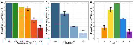 Stability of phage HPP-Temi virions in different physio-chemical conditions. (A) Stability under thermal treatment. (B) Stability in different NaCl concentrations. (C) Stability in different pH. In all the tiles, the initial HPP-Temi titer of the sample at the start of the experiment is indicated by the black dotted line (~109 PFU/mL). Bar heights represent the mean, and error bars indicate ± one standard deviation. Jittered points represent individual measurements.
