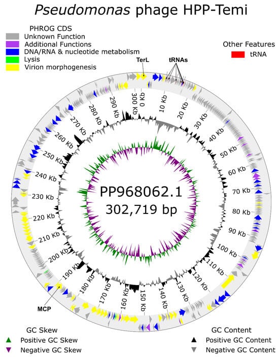 The complete genome of Pseudomonas bacteriophage HPP-Temi is a 302,719 bp long dsDNA molecule with a GC% of 46.46. Within this genome, 436 putative protein-coding open reading frames (ORFs) were predicted, as well as seven transport RNA genes. Functional annotation of putative HPP-Temi ORF products allowed us to predict functions for less than 33% of presumed proteins, with the vast majority (336 predicted proteins to be exact) currently remaining without any functional annotation (Figure 4).