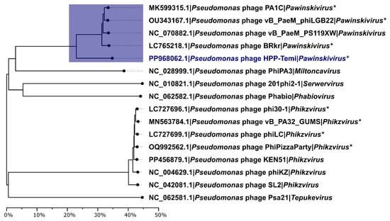 Intergenomic distance neighbor-joining tree of the isolated Pseudomonas phage HPP-Temi and its relatives from the public biological sequence repositories. The clade comprising HPP-Temi and other recognized or proposed Pawinskivirus phage genus representatives is highlighted by the blue rectangle. The label of the tip corresponding to phage HPP-Temi is colored blue. The tree is drawn to scale and is in units of VIRIDIC-calculated intergenomic distance percentages. Tip labels are in the form of “Genome accession number | Phage name | Genus”. An asterisk (*) after the genus name indicates that a given phage is not yet a part of the official phage taxonomy.