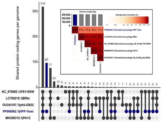 Similarities between Pawinskivirus representatives. Shared protein-coding gene counts across genomes are shown for either all the phages analyzed, the intersections of particular different phages, or individual phages. Only genes encoding for proteins having an identity of more than 70% are considered to be shared. An inset shows a heatmap demonstrating pairwise intergenomic similarity percentages between the same bacteriophages.
