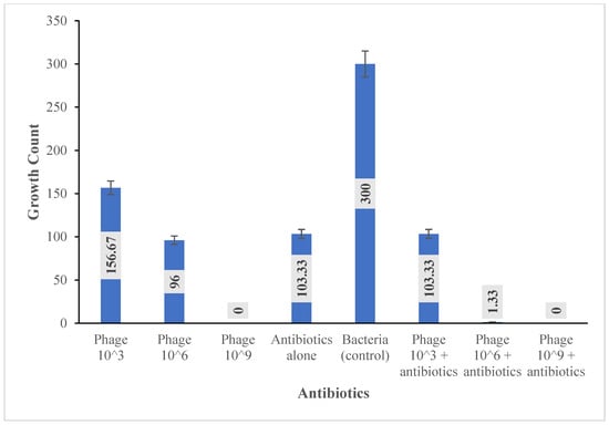 The result of the combination of antibiotics and phage HPP-Temi (103, 106, and 109 PFU/mL) showed inhibitory effects at varying concentrations (Figure 7). Ciprofloxacin (5 μg) was selected as one of the approved antibiotics for the treatment of P. aeruginosa infection according to performance standards for antimicrobial susceptibility testing. This was used for the combination effect by determining the CFU/mL after overnight incubation at 37 °C. P. aeruginosa Pa9 at 3.0 × 108 CFU/mL was used as a control (without phage or antibiotics). The phage and antibiotic combination at varying phage titers (103, 106, 109 PFU/mL) showed a synergistic effect by reducing the bacterial count at 103 to 1.0 × 102 CFU/mL, and at 106, only scanty growth was observed. No bacterial growth was observed at 109 PFU/mL in combination with antibiotics after overnight incubation. When compared with antibiotics alone, phages at 103 PFU/mL in combination with antibiotics showed no significant difference, whereas phages with 106 and 109 PFU/mL in combination with antibiotics showed a significant difference. Phage combination with antibiotic at 103, 106, and 109 PFU/mL with control isolate at 3.0 × 108 shows a significant difference (p < 0.05).
