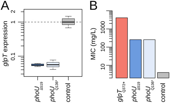 We finally sought to quantify the extent to which the drastic reductions in glpT expression translate into increases in fosfomycin resistance. To this end, we used the standard broth micro-dilution method to estimate the MIC for both phoU mutants (Section 3). Besides the wild-type, we also included as a reference a glpT mutant with a nonsense mutation (Q372*). This mutant should represent the maximum resistance level achievable when no fosfomycin is transported via GlpT, a situation where all entry is expected to be limited to inefficient passive diffusion through the outer membrane porins [37]. Previous studies on fosfomycin-resistant P. aeruginosa mutants with various glpT mutations showed that nonsense, missense, and indel mutations can all lead to large elevations of the MIC, with just minor differences among these classes [22]. Figure 2B demonstrates that the phoU mutants indeed exhibited a substantial increase in resistance levels (MIC: 256 µg/mL, a 64-fold elevation over the wild type). However, this increase was of moderate magnitude compared to the presumed upper bound observed in the glpT loss-of-function mutant (MIC: 4096 µg/mL, a 1024-fold increase over the wild type), suggesting that some fosfomycin still enters the cell via GlpT, despite the reduced expression measured in the phoU mutants.