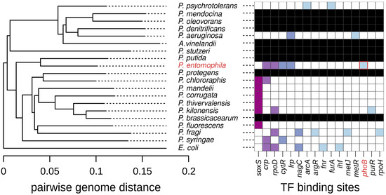To address these questions, we compared the glpT promoter sequences across 18 representative Pseudomonas species, as well as E. coli—a standard outgroup—and Azotobacter vinelandii, a prominent member of the Pseudomonadaceae family so closely related to Pseudomonas that it is sometimes classified within this genus [39]. To this end, we began by examining the evolutionary relationships among the 20 selected species, as illustrated in Figure 3, which presents a phylogenetic tree based on pairwise genome distances (Section 3). Next, we turned to the BPROM promoter prediction software to identify transcription factor binding sites within the promoter regions of the collection of glpT homologs. Figure 3 also displays the distribution of the detected sites among species, which, for reference, are organized according to the clustering suggested by the phylogenetic tree.