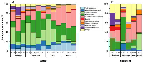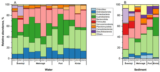 The most prevalent bacterial phyla in all water samples were Actinobacteriota, Proteobacteria, and Cyanobacteria. The cumulative relative abundance of these phyla varied considerably, from 40.81% in Melnragė (2021) to 82.57% in the Port area in 2018. The Actinobacteriota phylum exhibited a lower abundance in sediment samples than in water samples. Conversely, the relative abundance of Proteobacteria was approximately equivalent in water and sediment samples. The highest relative abundance of Cyanobacteria was observed in the Port area in 2018, while the lowest was observed in the Port area in 2023. In sediment samples, the relative abundance of Cyanobacteria exhibited variation, ranging from 0% in Šventoji (2023) to 34.14% in Kintai (2023). The relative abundance of Bacteroidota phylum bacteria in water samples varied, from 9.84% in the Port area in 2018 to 56.28% in Melnragė in 2021. In sediment samples, the range was even more pronounced, spanning from 5.28% in Kintai (2023) to 49.75% in Melnragė in 2021.
