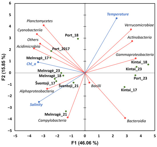 Water temperature, salinity, and chl a concentration were recorded at the sampling sites in 2017, 2018, 2021, and 2023. The mean water temperature during the sampling was similar for all sampling sites, ranging from 17.85 ± 2.87 °C in Šventoji to 19.85 ± 2.56 °C in the Port area. Descriptive statistics of each parameter per sampling site are shown in Supplementary Table S3. Still, it differed significantly among years (p < 0.05). Conversely, salinity differed significantly between sampling sites (p < 0.05), while no differences were observed between years. PCA analysis applied to our dataset (10 most abundant bacterial classes, temperature, salinity, and chl a) showed that 61.91% of the total variance could be explained by components F1 = 46.06% and F2 = 15.85% (Figure 3).