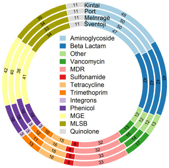 Fifty percent of all identified resistance genes were found to belong to MDR and three distinct antibiotic groups: aminoglycosides, beta-lactams, and MLSB. The ARGs encoding resistance to aminoglycosides (n = 60) varied from 47 (78.33%) in Šventoji to 50 (83.3%) both in Melnragė and Port area. A total of 42 (77.78%) beta-lactam resistance genes were identified in the Šventoji, Melnragė, and Port samples, with a slightly higher number of genes detected in the Kintai sample (45, 83.33%). The MLSB-encoding genes ranged from 33 (70.21%) in Melnragė to 35 (74.47%) in Kintai. The number of MDR genes varied from 32 (82.05%) in Šventoji and Melnragė to 33 (84.62%) in Port and Kintai.