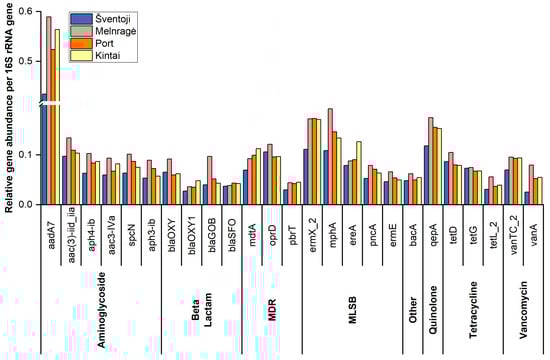 Of the 25 most prevalent ARGs identified in the pooled Šventoji, Melnragė, Port area, and Kintai sites, six encoded resistance to aminoglycosides (aadA7, aac(3)-iid_iia, aph4-ib, aac3-Iva, spcN, and aph3-ib), five to MLSB (ermX_2, mphA, ereA, pncA, and ermE), beta-lactams (blaOXY, blaOXY1, blaGOB, and blaSFO), multidrug resistance (mdtA, oprD, and pbrT), tetracyclines (tetD, tetG, and tetL_2), vancomycin (vanTC_2 and vanA), quinolones (qepA), and other antibiotics (bacA). The number of genes encoding resistance to each antibiotic is shown in Figure 5.