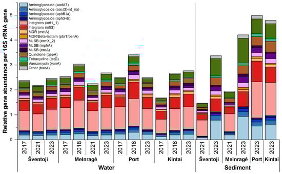 The cumulative relative abundance of the 15 most abundant antibiotic resistance genes in water and sediment samples from the Curonian Lagoon and the Baltic Sea, collected in 2017, 2018, 2021, and 2023 at the sites of Šventoji, Melnragė, Port, and Kintai.