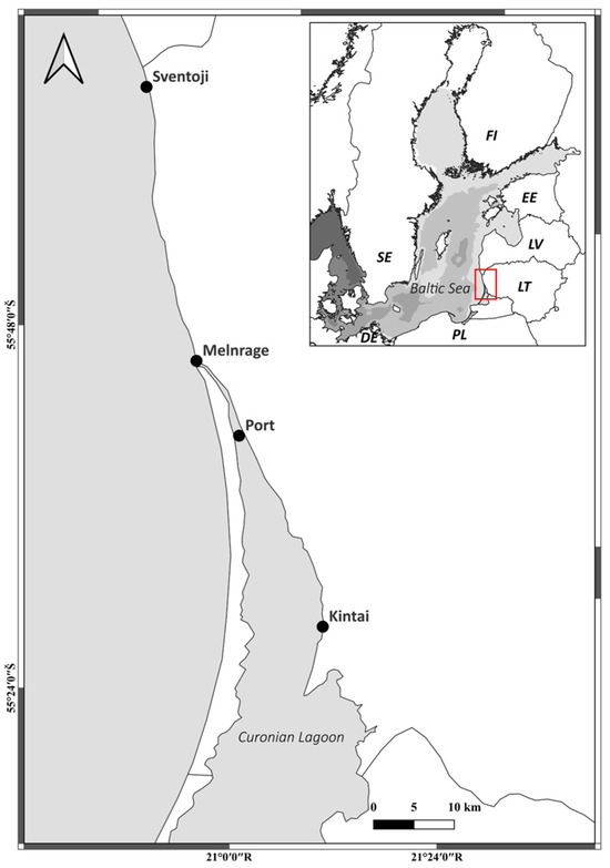The geographical area under consideration in this study is situated on the southeastern coast of the Baltic Sea. From sixteen designated coastal bathing sites, two sites on the Baltic Sea coast (Šventoji and Melnragė), one Curonian Lagoon bathing site (Kintai), and a Port area (further as Port) (as the water exchange area between the lagoon and the Baltic Sea) were sampled (Figure 7). The Curonian Lagoon is Europe’s largest lagoon situated around the Baltic Sea, and it is primarily influenced by wind and the discharge of the Nemunas river. The freshwater outflow from the lagoon can be observed on beaches located to the north of the sole channel connecting the lagoon with the Baltic Sea, namely, the Klaipeda Strait, where the Port is allocated [25]. The salinity ranges from two to nearly seven practical salinity units (PSUs).