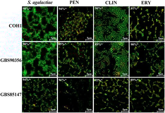 Fluorescence analysis of S. agalactiae persister cells. Streptococcus agalactiae (COH1, GBS90356, and GBS85147) control cells (no antibiotic) and persister cells at concentrations of 8 μg/mL penicillin (PEN), 6 μg/mL clindamycin (CLI), and 4 μg/mL erythromycin (ERY); (*) white asterisk represents the percentage of viable cells by LIVE/DEAD marking.