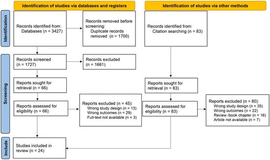 Our initial search identified 3427 reports (Supplementary Material S1). Following duplicate removal (n = 1700), we screened the titles and abstracts of the remaining 1727 records, excluding 1661 reports. After a detailed full-text review of the 66 remaining studies, we found 21 that met the final inclusion criteria (Figure 1). Citation searches of these articles and relevant reviews yielded 83 reports, of which three fulfilled the inclusion criteria. In total, 24 articles were extracted. The list of abbreviations used in this review are given at the end of this article.