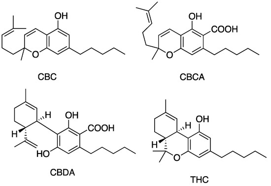 - Hanuš, L.O.; Meyer, S.M.; Muñoz, E.; Taglialatela-Scafati, O.; Appendino, G. Phytocannabinoids: A unified critical inventory. Nat. Prod. Rep. 2016, 33, 1357–1392. [Google Scholar] [CrossRef]