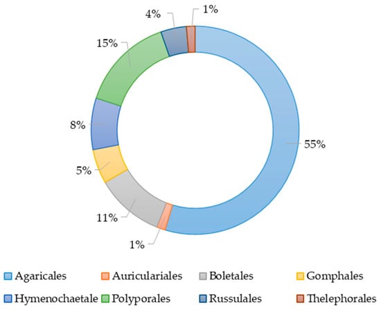 The percentage of basidiomycete orders’ representatives in studies on the antimicrobial activity of their various extracts.