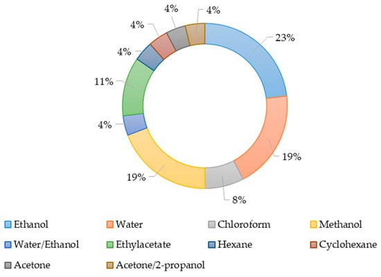 The solvents used to produce the extracts are shown in Figure 2. Ethanol, methanol, and water were most often used as extractants during the study of the antimicrobial activity of extracts. Obviously, the effectiveness of various solvents is related to the chemical nature of the active substance. The presence of active substances in producer biomass depends on their taxonomic affiliation, geographical and seasonal features of growth for wild specimens, or the growing conditions in the laboratory.