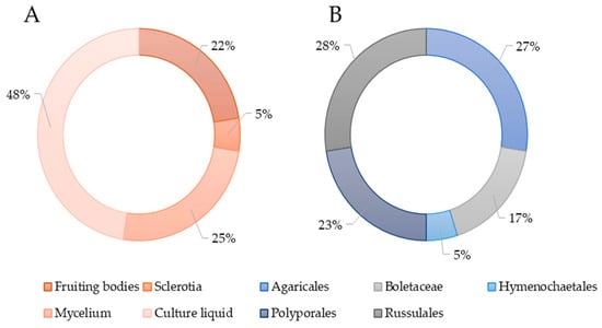 The species of basidiomycetes used in the study of their extracts antimicrobial action belonged to eight orders, namely Agaricales, Polyporales, Boletales, Hymenochaetales, Russulales, Auriculales, Gomphales, and Thelephorales (Figure 1). More than half of all studies had been conducted with species from the order Agaricales. The orders Auriculares and Thelephorales were represented by a single species. The species belonging to the objects was determined on the basis of morphological characteristics or sequencing.