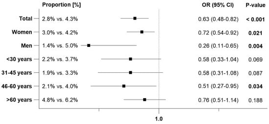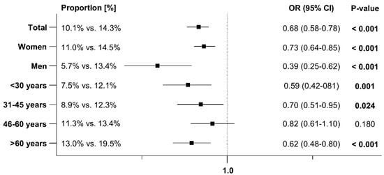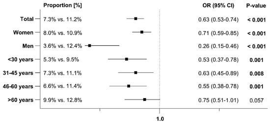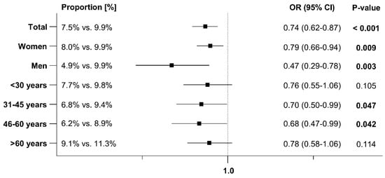 All regression models (logistic or Cox) were run separately for men and women as well as for age groups (<30 years, 31–45 years, 46–60 years, >60 years). In all analyses, a p-value of <0.05 was considered statistically significant. Analyses were conducted using SAS Vers. 9.4 (SAS Institute, Cary, NC, USA).