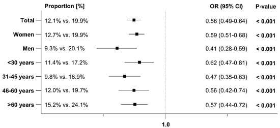 At least one additional antibiotic prescription for treating an early recurrence was issued to 7.3% of patients with Angocin® prescriptions and 11.2% of patients with antibiotic prescriptions within 1–30 days after the index date. Within 31–365 days after the index date, 12.1% of Angocin® patients and 19.9% of antibiotic patients received at least one further antibiotic prescription. The results of the univariate logistic regression model are displayed in Figure 5 and Figure 6. Angocin® prescription was associated with significantly lower odds of further antibiotic prescriptions in both time periods (1–30 days after the index date: OR: 0.63; 95% CI: 0.53–0.74, 31–365 days after the index date: OR: 0.56; 95% CI: 0.49–0.64). This association was observed across all subgroups, with a stronger effect in men than in women (Figure 5 and Figure 6).