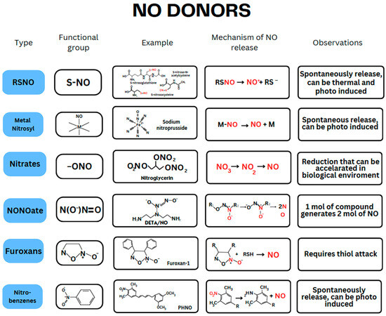 The most commonly used classes of NO donors are NONOates, furoxans, and nitrobenzenes, characterized by the [N(O)NO]−, furoxan, and nitrobenzenes functional groups, respectively, as shown in Figure 1 [31,33].