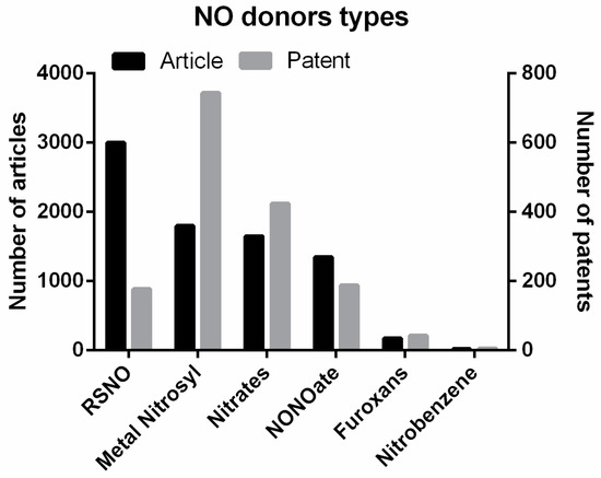 Figure 2 shows the articles and patents for each NO donor type described, according to the Web of Science Core Collection and Derwent databases, respectively (research made on 24 April 2024). According to articles published, the RSNOs are the most used and metal nitrosyl complexes, according to a registered patent.