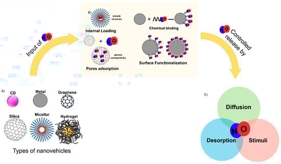 Sequence for nanoparticles with NO donors. (A) Type of nanovehicles studied for antimicrobial and anti-biofilm potential. DC: carbon dots. (B) Input of NO donors in the nanoparticles; adapted from [31]. Copyright 2023 American Chemical Society. (C) Types of controls for release of NO.